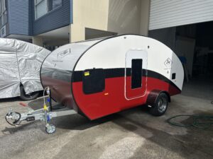 To bring this idea to life, we partnered with an international company to introduce what became known as the JAG Pod – a sleek, futuristic pod-style camper. While the design was stunning and the features impressive, it didn’t quite hit the weight target. At 720 kg tare and 120 kg on the ball, it’s simply too heavy for smaller vehicles like the Suzuki Jimny.